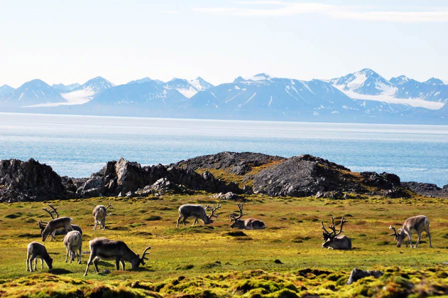 Svalbard is a true Arctic environment, where many iconic species spend their entire lives, entwined with the winter and spring sea ice. But with the arrival of summer—brief as it is—the archipelago bursts to life as countless migratory species settle in to take advantage of the season’s endless daylight and abundant food. Chief among Svalbard’s summer migrants are seabirds, waterfowl, and other birds, joined by marine visitors such as baleen whales—including the mighty blue whale. Though wildlife sightings aren’t guaranteed, these giants are sometimes observed foraging in the rich Arctic waters. Under the midnight sun, plant life also flourishes. While less diverse than in southern regions, Svalbard hosts hundreds of plant, lichen, and moss species, from hardy grasses to vibrant wildflowers. For a few brief months, snow and ice are replaced by pockets of green and splashes of color, framed by snowcapped peaks —a fleeting transformation of the High Arctic landscape. Throughout the summer, sea ice fractures, melts and disperses. Many species that depend on it shift north and east where ice lingers, or remain ashore until it returns in late fall. While ice may be less frequent, the open water offers greater access to the archipelago’s northern and eastern reaches. If we do encounter ice, we’ll pause to explore it. At this time of year, wildlife is more often spotted in the water, along shorelines, or gathered in bustling bird colonies clinging to the cliffs. Some terrain here is nearly vertical, with seabirds colonizing every possible ledge. Little auks, guillemots, and puffins nest in rocky crevices, spending the brief summer flying back and forth to feed themselves and their chicks before their f irst flights and plunges. Looking upward while seated in a Zodiac, the sky may seem alive with more birds than you can count, and sometimes we’ll explore near these cliffs on foot. Keep watch for other iconic species too, such as Arctic terns, common eiders, and the occasional king eider. The sounds are astonishing—an Arctic “silence” feels alive with nature’s calls. Standing beneath towering seabird cliffs renders visitors speechless. Summer offers the chance to step ashore and walk on bare ground, though patches of snow can linger. We may hike into foothills, valleys, and Arctic beaches— land shared with polar bears. While sightings are farther inshore, their paw prints in sand or mud tell their story. Take time to look around and underfoot, where hardy vascular plants and wildflowers bloom. You might also spot driftwood—not from ancient Svalbard forests, but carried here by Arctic currents from Siberia, where tree trunks and branches are swept up in the Arctic currents, ultimately coming to rest here. Additionally, we may see reindeer, as they busily forage on the bountiful summer plant life. Although the weather in midsummer is often cool—even crisp—in midsummer, it’s possible to enjoy reasonably warm days in Svalbard. It’s a surreal experience—feeling the warmth of the summer sun knowing you’re less than 700 nautical miles from the North Pole. As summer warms and sea ice recedes, glaciers come alive—meltwater hastening erosion, tidewater glaciers calving ice with thunderous force. From a Zodiac amid icebergs and brash ice, listen for the crackle of melting ice, the lap of currents, and Arctic terns calling overhead. During summer, if conditions align, it might also be possible to visit some of Svalbard’s residents, be they trappers or researchers. There are a number of trappers’ cabins dotted across the archipelago, and the stories their