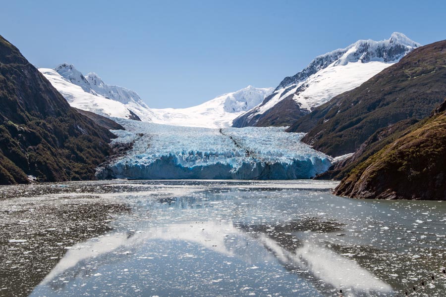 Also called Fjord of the Mountains or Channel of the Mountains, the Estero Las Montañas fjord offers enchanting landscapes. Situated in large part in the Alacalufes National Reserve, this former glacial valley now flooded with water seems to stretch on for ever inland. Surrounded by tall mountains with lush slopes and edged with numerous glaciers tinged in various shades of blue, it will be a highlight of your cruise.