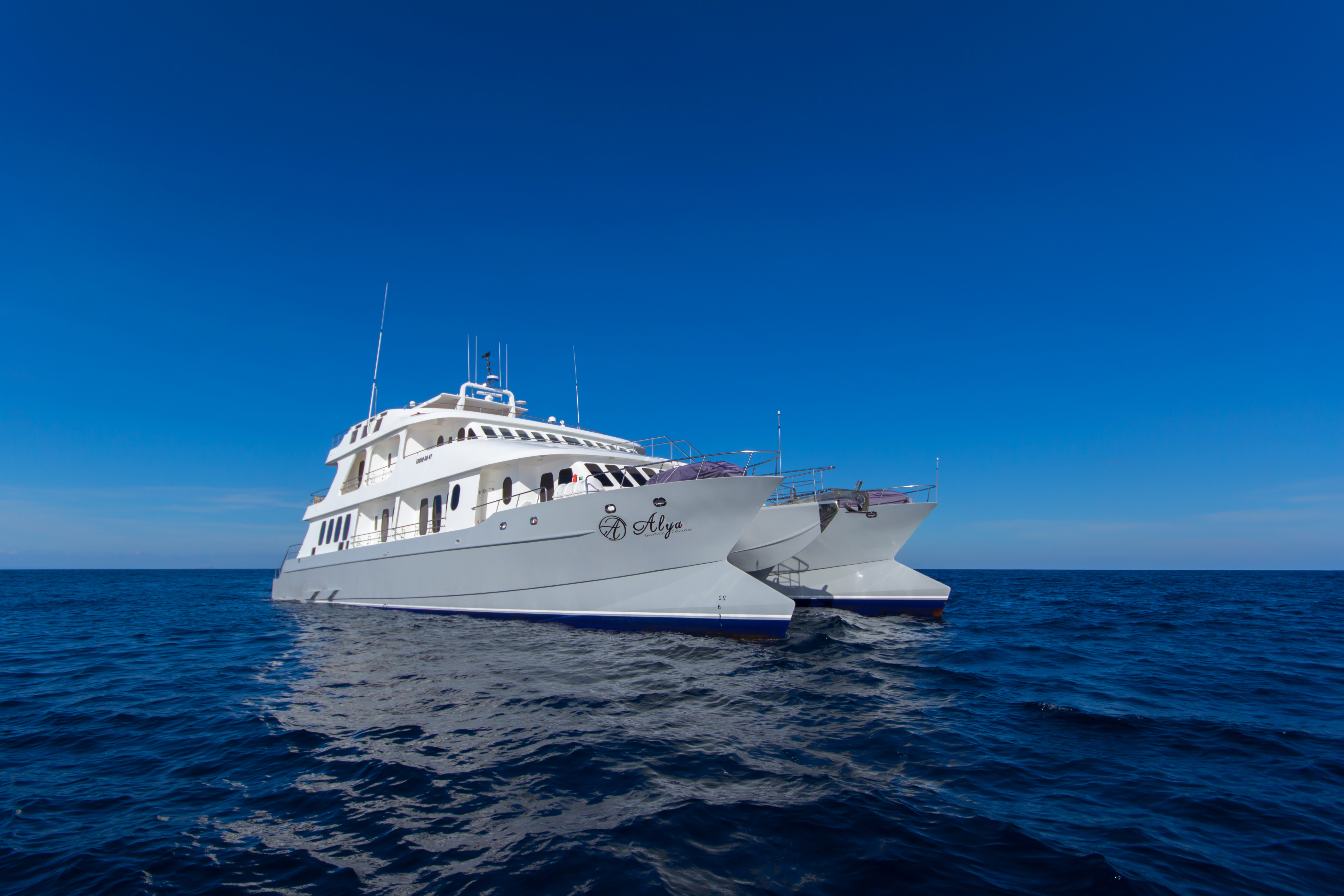 Built in 2017, the elegant Alya is a superior first class motor catamaran, designed to carry up to 16 passengers. The ship offers 9 comfortable cabins, all tastefully decorated and featuring private facilities, hot and cold water, air-conditioning, a safety deposit box and the choice of double or twin beds. 4 of the cabins are located on the upper deck, 5 on the main deck and 8 of the cabins have a private balcony. On board there is a library, dining room, two bars and an extensive sundeck with a panoramic Jacuzzi. The catamaran sails with a crew of 8 plus a bilingual, certified naturalist guide. The 4, 5 and 8-day itineraries include hiking, snorkelling and kayaking in your exploration of the Galapagos Islands.