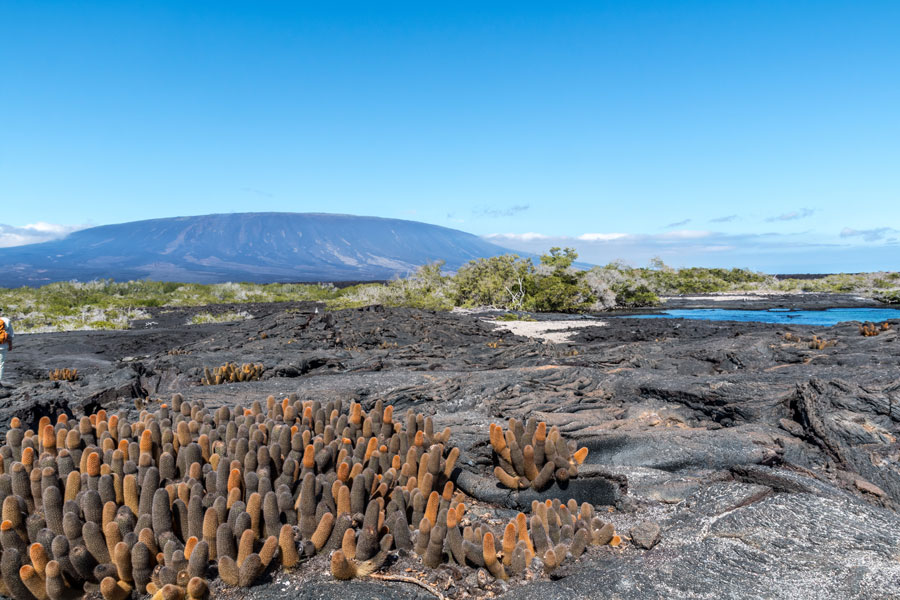 There is little in the way of vegetation, but some hardy pioneer plant species and cacti have begun the process of breaking the lava rocks down into something friendlier for plants and animals. There are small lizards and snakes to be found in and among the rocks. Along the coastline, tidal pools may trap some interesting sea life, and you may get to see some marine iguanas swimming and diving down to feed on underwater algae. Also snorkeling along the shoreline, lucky guests may spot some Galapagos Penguin, green sea turtles and white tip sharks.