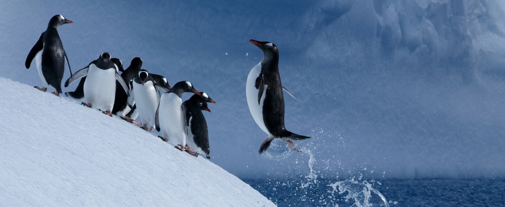 Spot penguins from your zodiac or hiking in Antarctica. Common species on the peninsula are the Gentoo, Chinstrap and Adelie penguins.