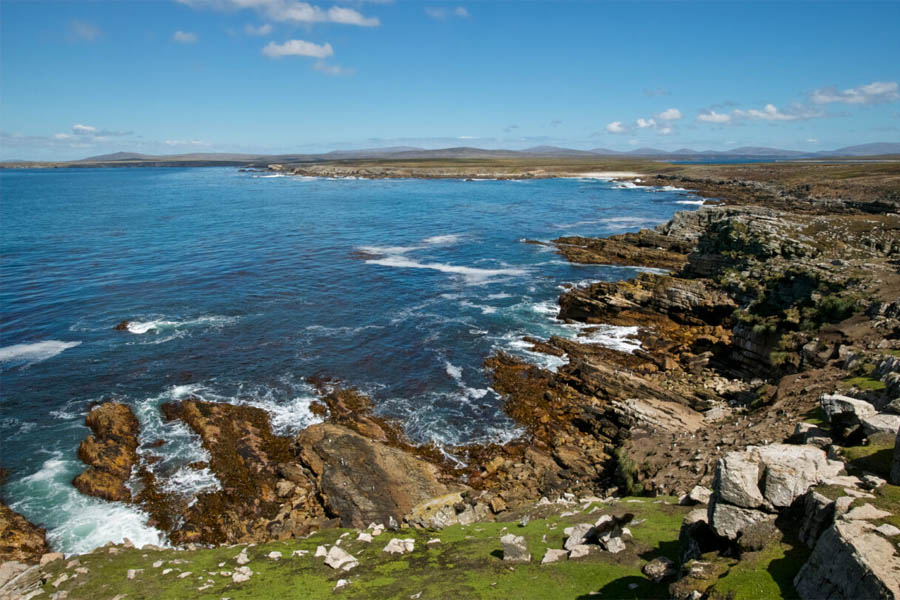 We continue our exploration of the Falklands in the isolated outlying islands. These bleakly beautiful isles are havens for wildlife. Large colonies of seabirds, perched on windy bluffs overlooking azure seas, are easily accessible by hiking over lush meadows. At this time, black-browed albatross soar down from above while feisty rockhopper penguins leap up surf-battered cliffs from below to feed their large chicks amongst the tussocks.