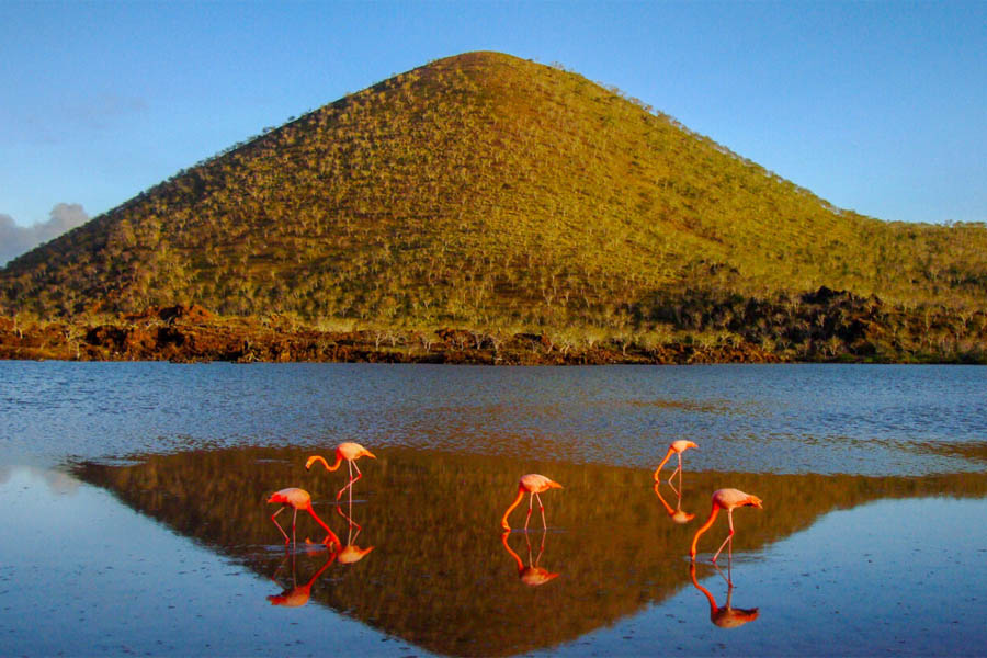This morning, you'll head to Cormorant Point on Champion Islet. This site boasts perhaps the best flamingo lagoon in the Galapagos, one of the largest in the islands. Situated between two tuff lava cones, the area exudes a special atmosphere. Besides flamingos, you'll have the chance to observe various species of shorebirds, including common stilts, white-cheeked pintail ducks, and other migratory birds. Two distinct beaches await exploration: "The Green Beach," named for its high percentage of olivine crystals in the sand, and the "Flour Sand Beach," composed of coral.